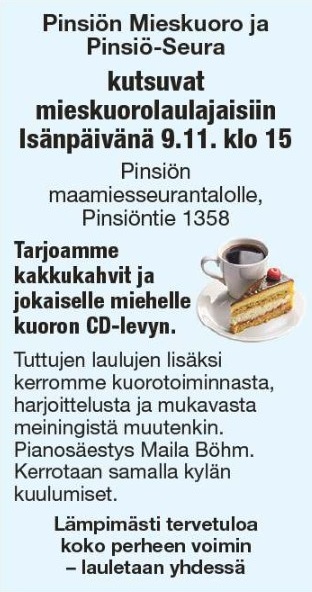 Pinsiön Mieskuoro ja Pinsiö-Seura kutsuvat mieskuorolaulajaisiin Isänpäivänä 9.11.2025 klo 15:00 Pinsiön maamiesseurantalolle, Pinsiöntie 1358.